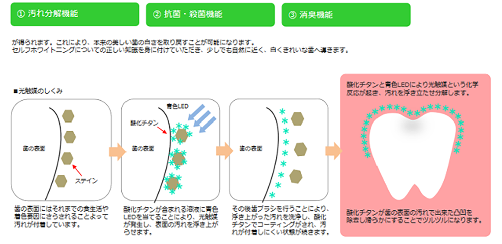 酸化チタンとは、食品や歯磨き粉等の医療品や化粧品など日常的に多くのものに使用されている安全性の高い無機化合物です。 そこに、安全で特殊なビューティホワイトマシンのLEDを当てることで光触媒を発生させます。